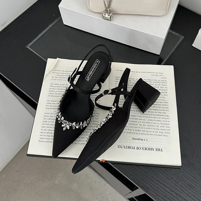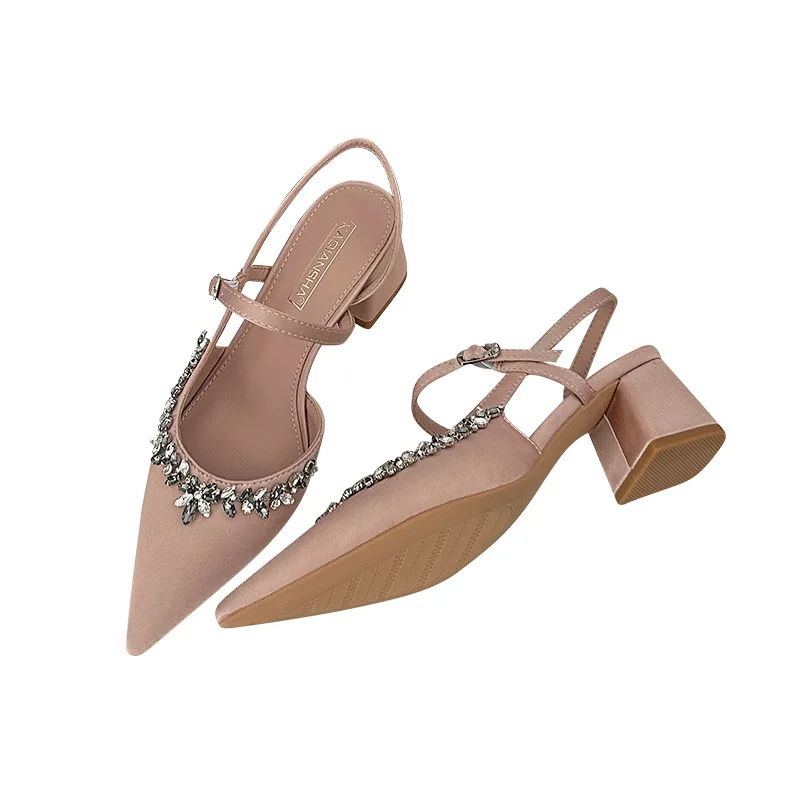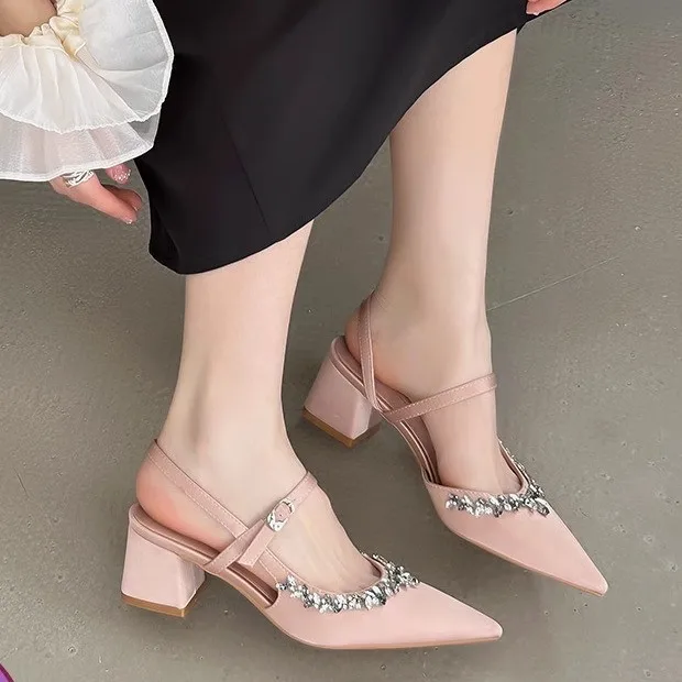 2026 Summer New Style Solid Pointed Rhinestone High Heel Thick Heel Champagne Color Strap Sandals Half Slippers Women's